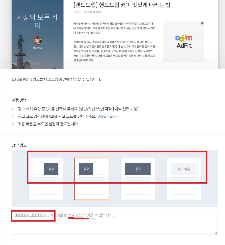 또한, 광고를 게재하기 위해선 광고 코드를 발급받아야 하는데